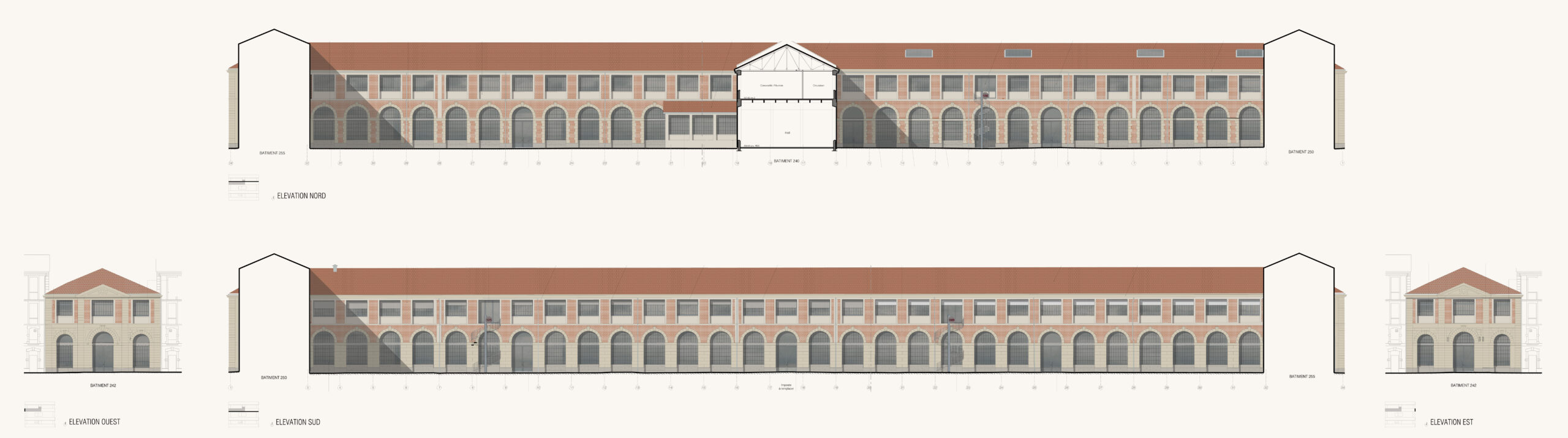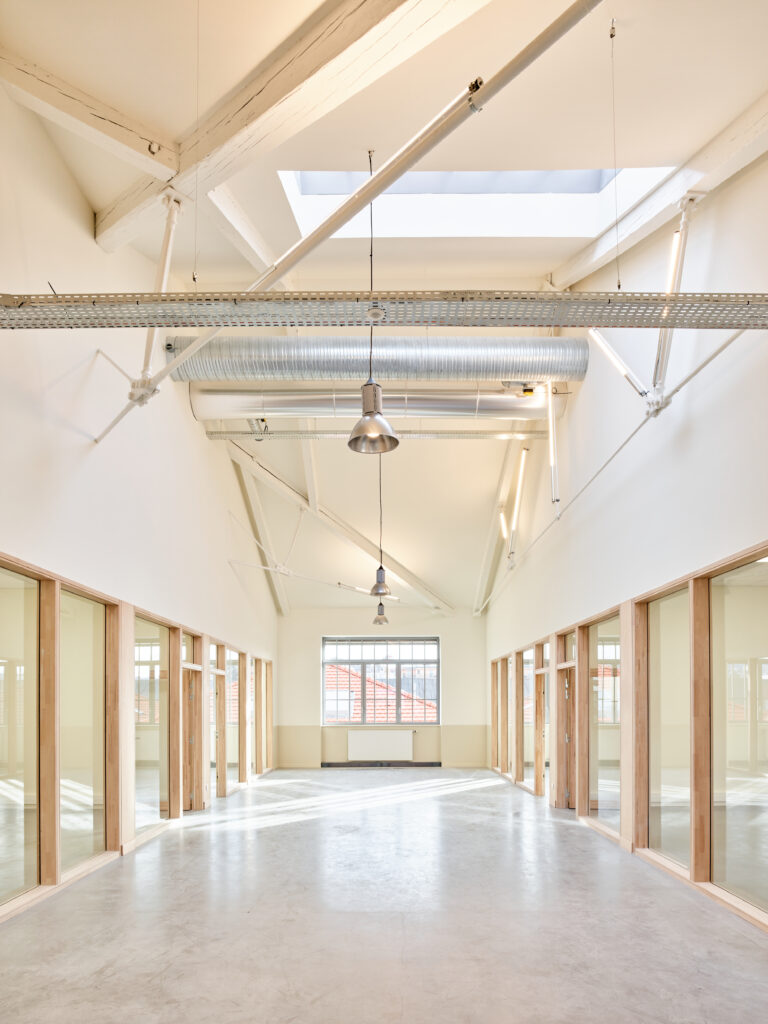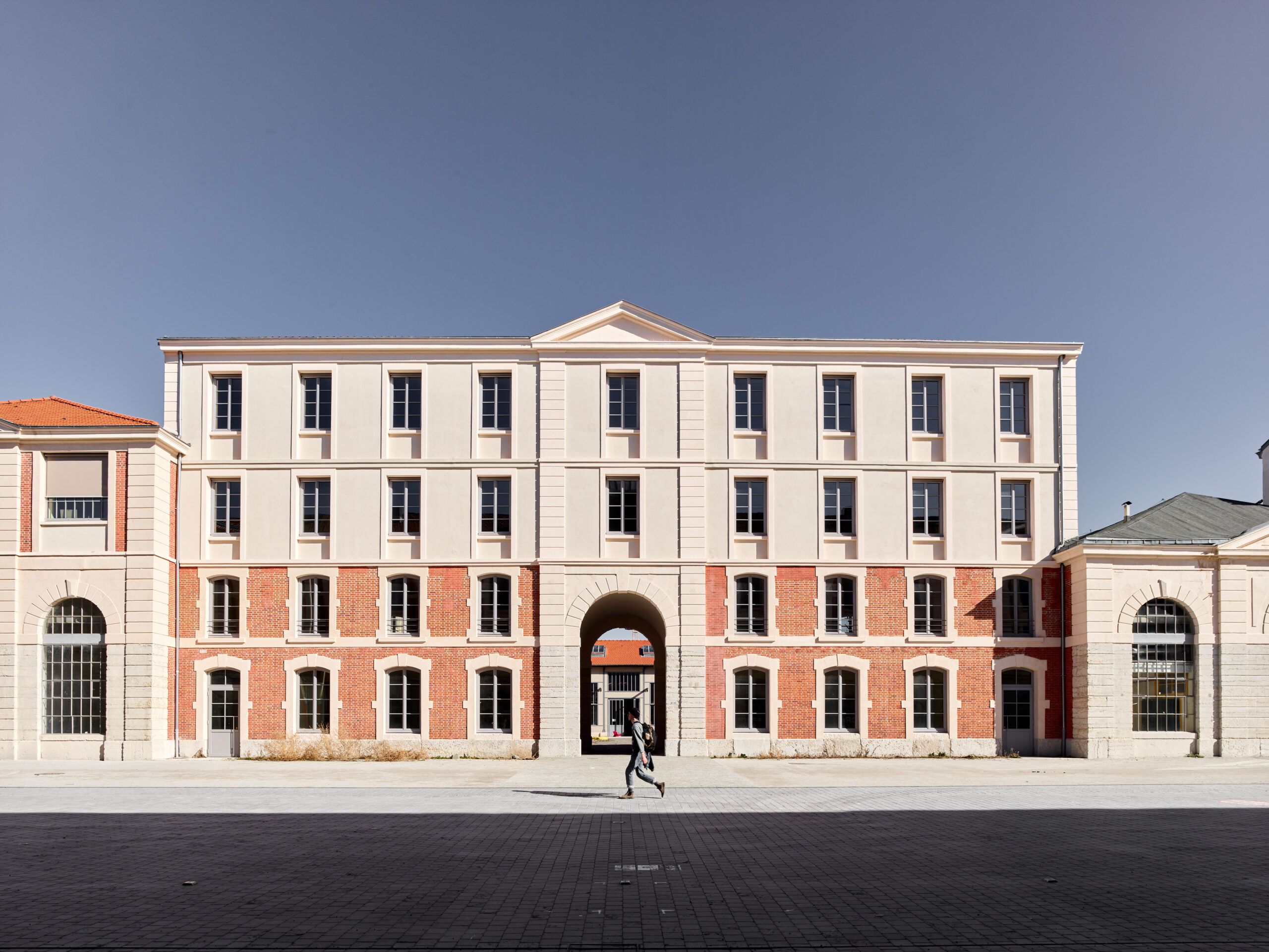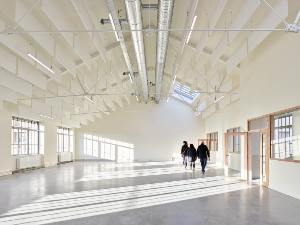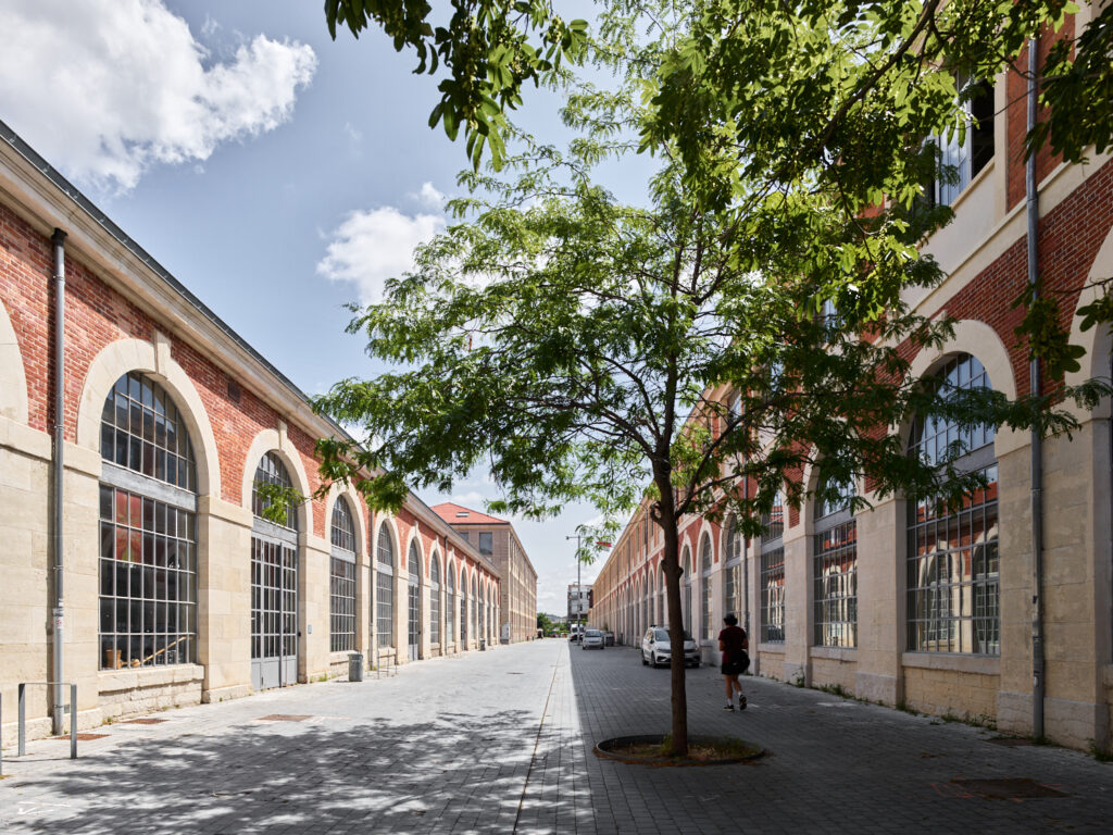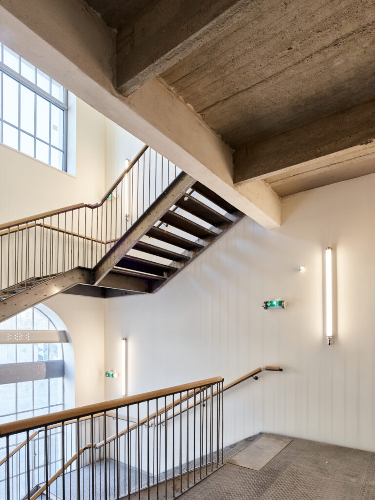 Inscrite dans un marché cadre depuis 2014, notre intervention s’échelonne en plusieurs programmes conçus pour intégrer les nouvelles activités de la Manufacture dans cette dynamique. Ses usages, pluriels et complémentaires, s’articulent autour d’espaces tertiaires accueillant des petites et moyennes entreprises innovantes du secteur créatif stéphanois : architectes, designers, graphistes, fab lab, agences de communication, rassemblées sous le sigle de « Grande Usine Créative ». Cette offre s’est développée en 3 phases de travaux, de 2017 à 2022. Un restaurant collaboratif, « la fabuleuse cantine », centré autour de la cuisine durable, des halles événementielles, ainsi que des espaces d’expositions ont également été aménagés et font revivre les bâtiments de la Manufacture. Si chaque intervention a ses particularités, une unité d’organisation et une continuité visuelle s’opèrent entre les différents projets pour offrir un ensemble harmonieux, qui constitue un exemple de réhabilitation patrimoniale pérenne et durable. En parallèle, comme pour entrer en résonance avec ces nouveaux usages, la Manufacture accueille la biennale internationale du design.