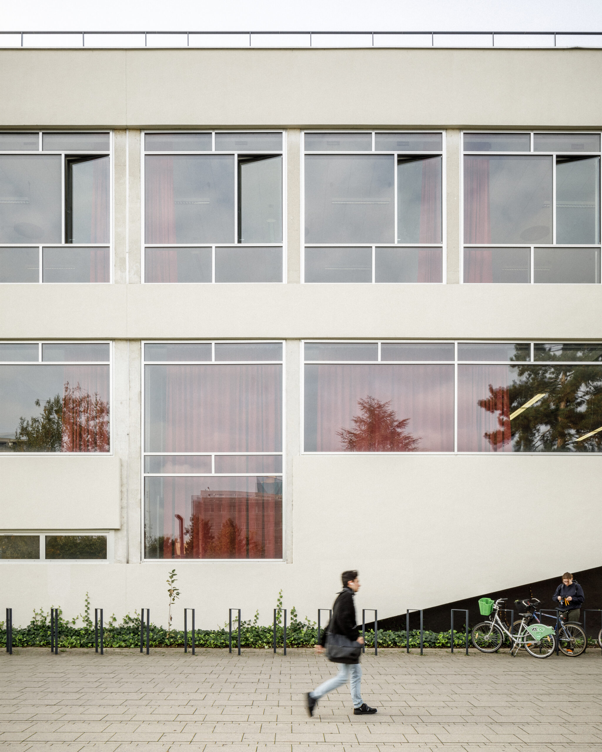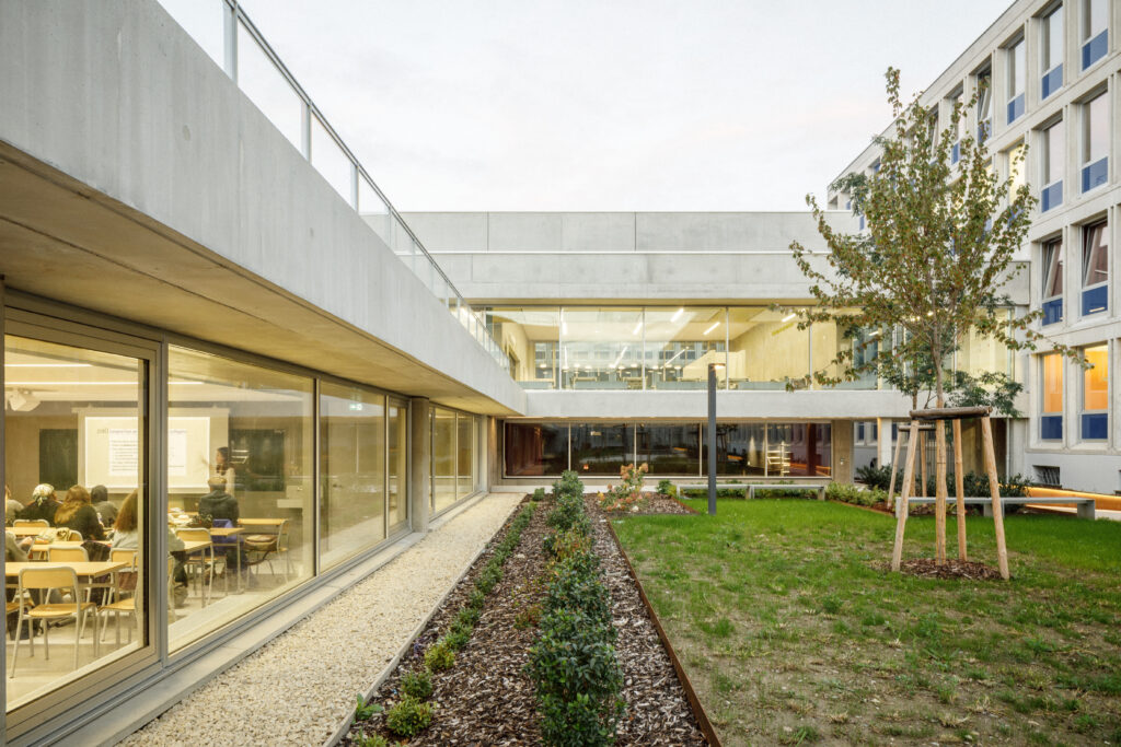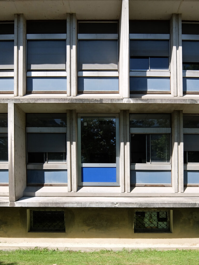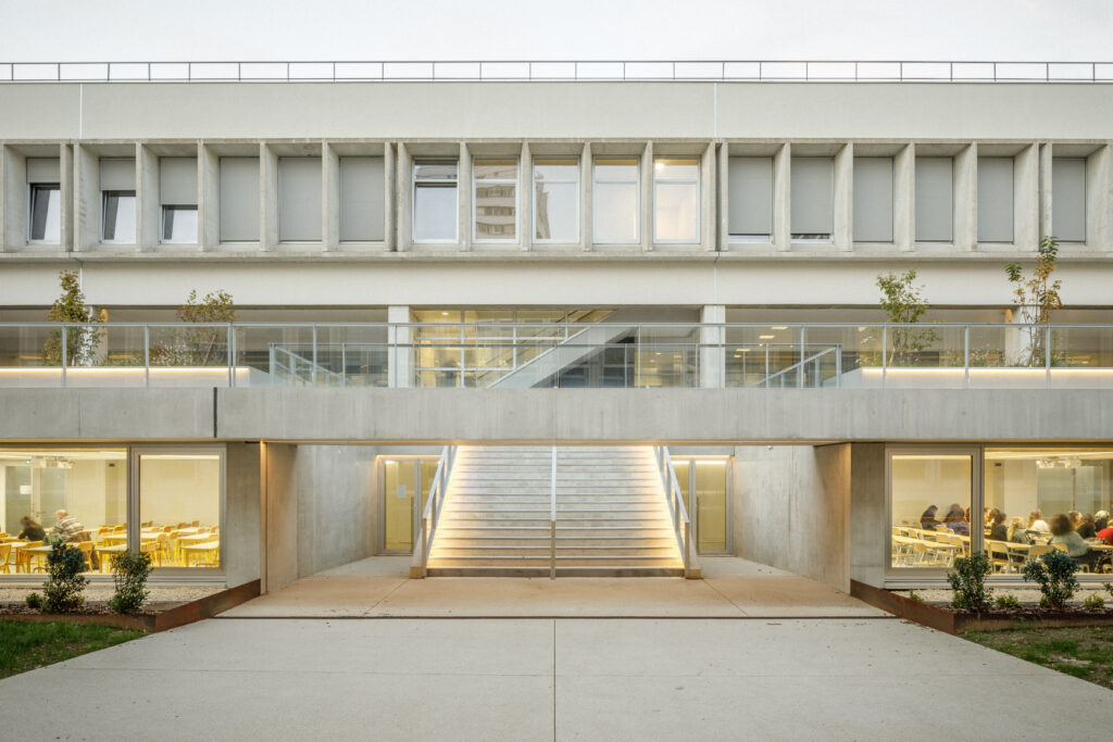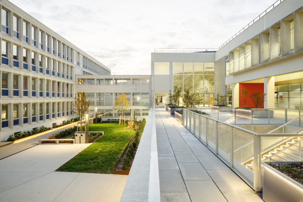 Parmi les édifices notables qui composent le site, la Faculté de Droit, monument historique et labellisée patrimoine XXème, ou encore la célèbre Tour de Chimie, sont souvent mis à l’honneur. La reconnaissance de l’Université des Sciences Humaines, usuellement nommée le Patio, comme ouvrage remarquable et structurant de l’Esplanade se faisait jusqu’à présent plus discrète. Pourtant, son architecte, Pierre Vivien, a proposé un ensemble reprenant toutes les innovations constructives de son époque, dans une écriture puissante et démonstrative qui confère une identité forte au Patio. Face à ce patrimoine moderne, trop souvent délaissé, nous avons donc entrepris une rénovation énergétique et une restructuration efficaces, au service d’un bâtiment qui ne demandait qu’à continuer sa vie.