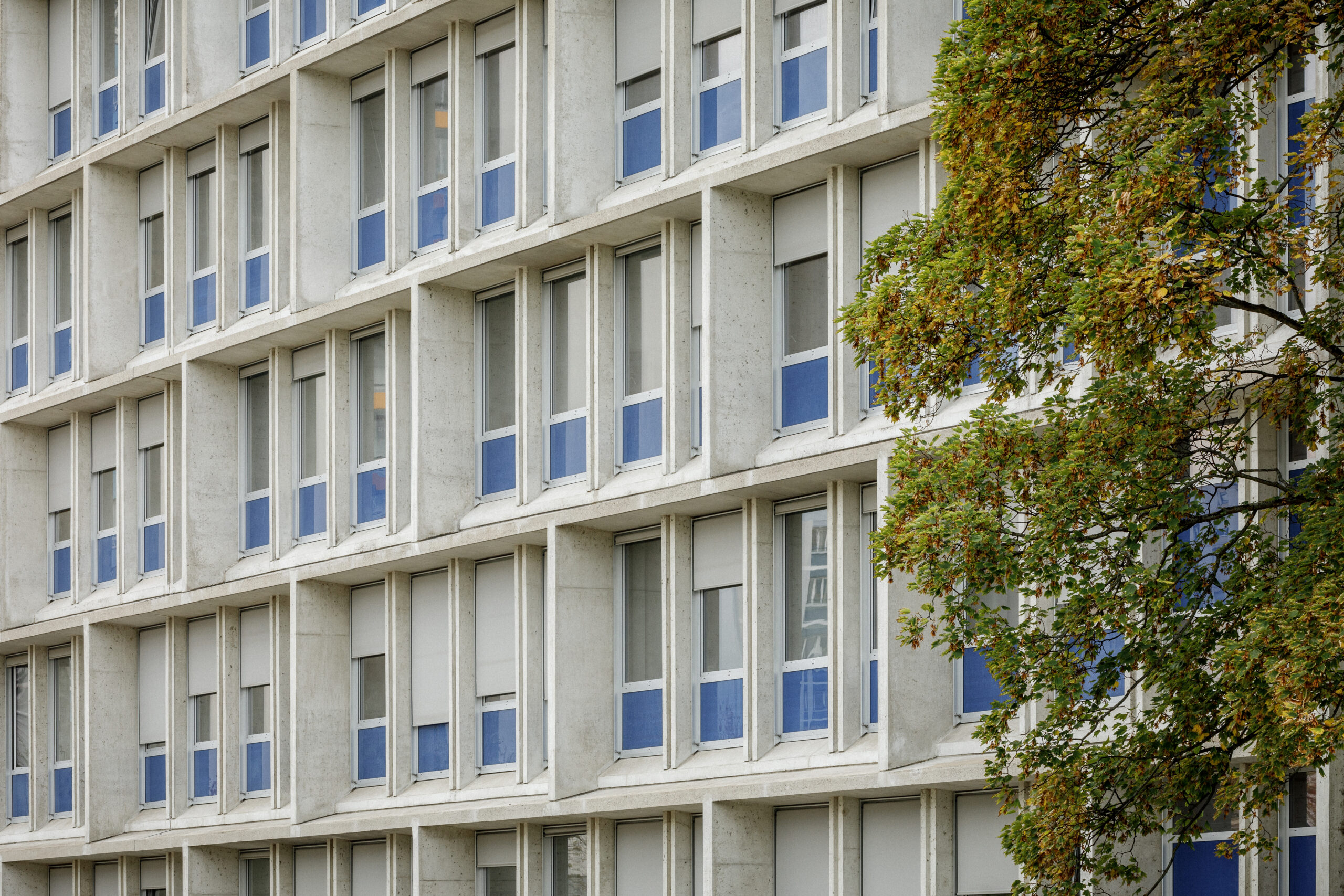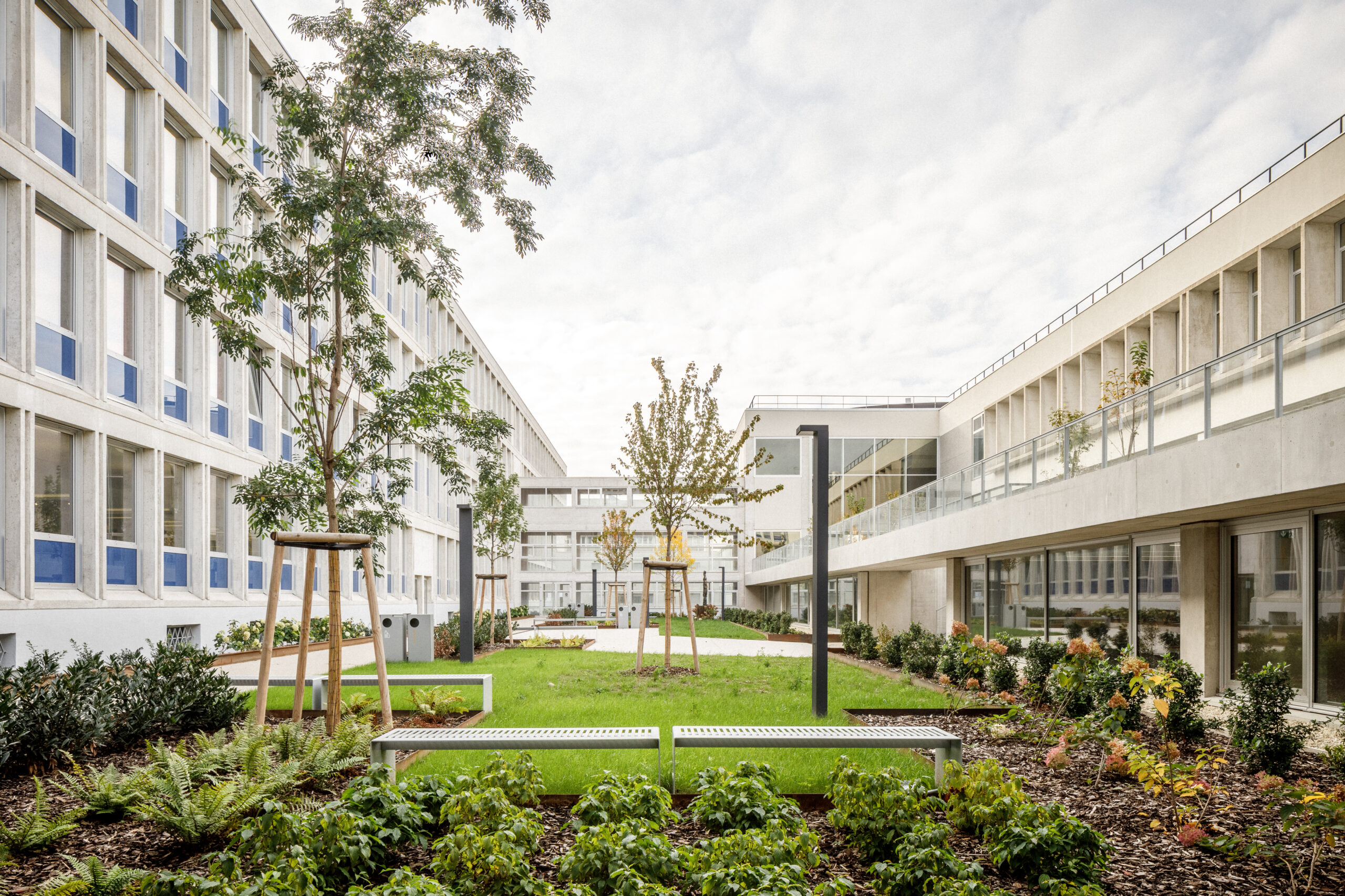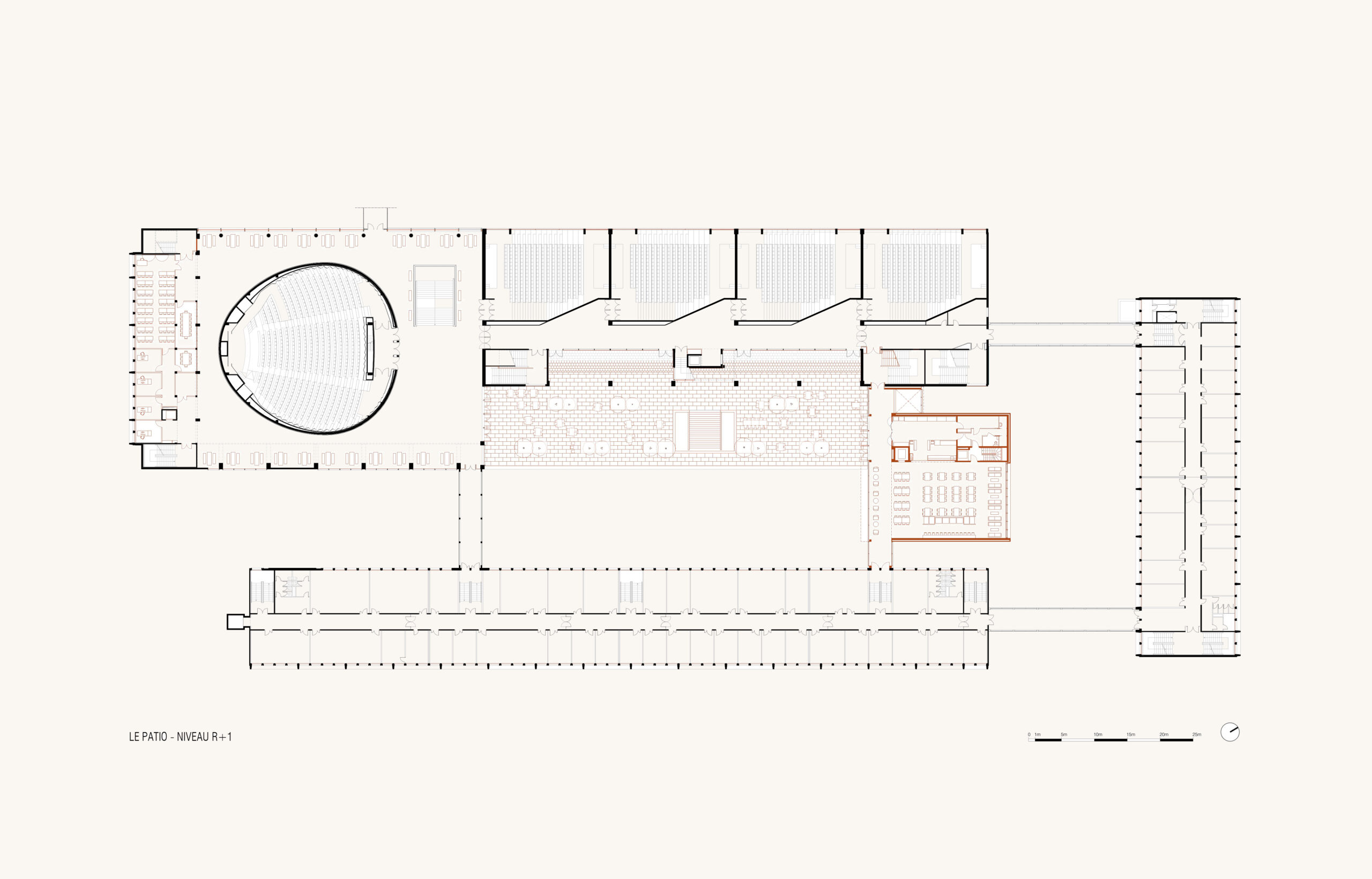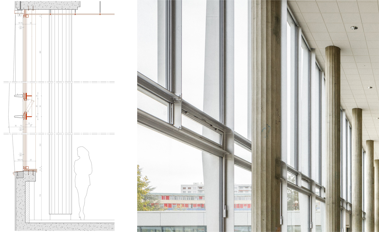 Parmi les édifices notables qui composent le site, la Faculté de Droit, monument historique et labellisée patrimoine XXème, ou encore la célèbre Tour de Chimie, sont souvent mis à l’honneur. La reconnaissance de l’Université des Sciences Humaines, usuellement nommée le Patio, comme ouvrage remarquable et structurant de l’Esplanade se faisait jusqu’à présent plus discrète. Pourtant, son architecte, Pierre Vivien, a proposé un ensemble reprenant toutes les innovations constructives de son époque, dans une écriture puissante et démonstrative qui confère une identité forte au Patio. Face à ce patrimoine moderne, trop souvent délaissé, nous avons donc entrepris une rénovation énergétique et une restructuration efficaces, au service d’un bâtiment qui ne demandait qu’à continuer sa vie.