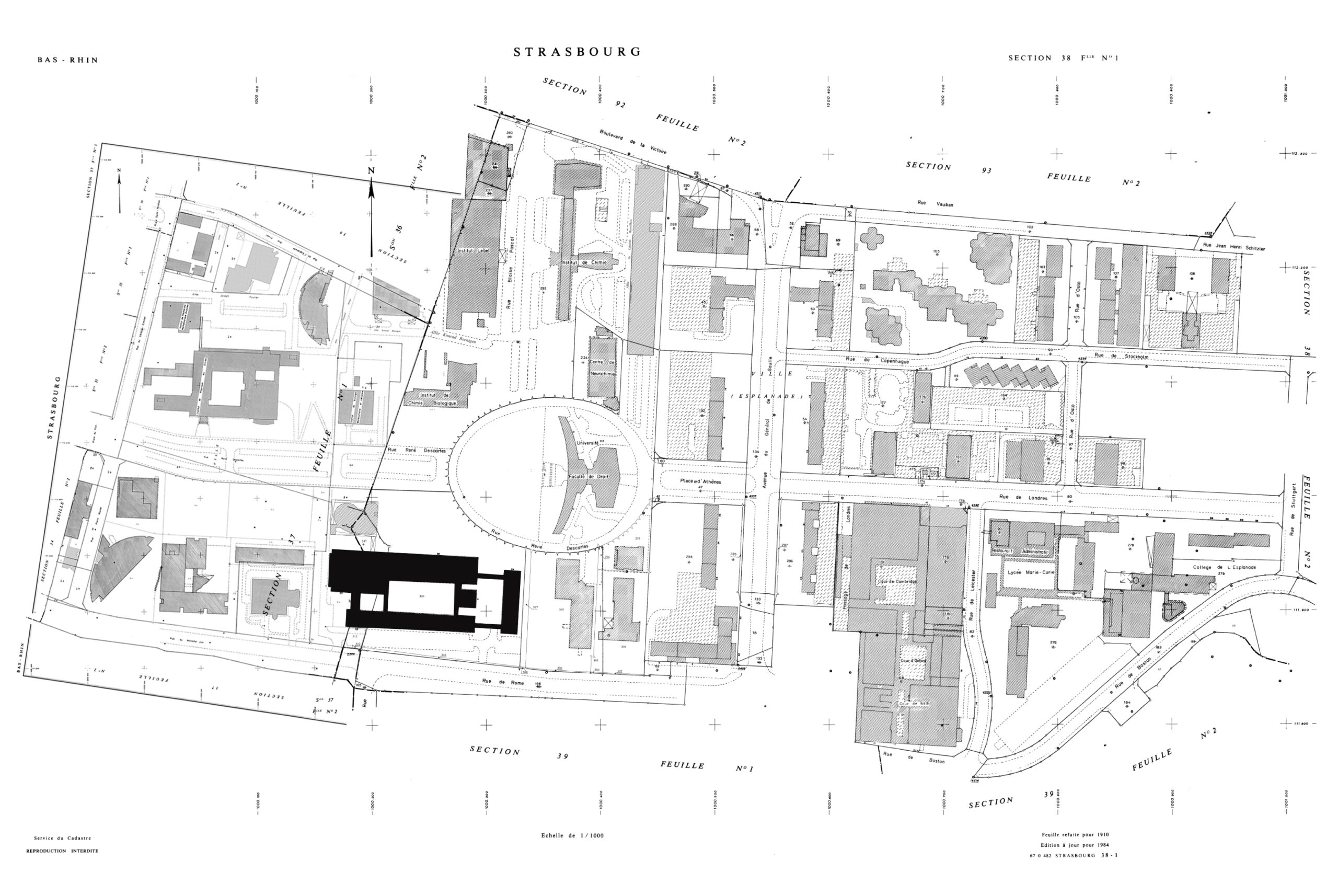 En cœur de ville, les édifices monumentaux qui composent le nouveau campus suivent le cardo-decumanus, les axes fondateurs de la ville, offrant un lien symbolique entre ancienne Cité et nouvelle urbanité. Cette implantation exceptionnelle, appuyée par une composition architecturale remarquable, permit de faire perdurer le rayonnement de l’université strasbourgeoise, tout en la propulsant dans sa modernité.