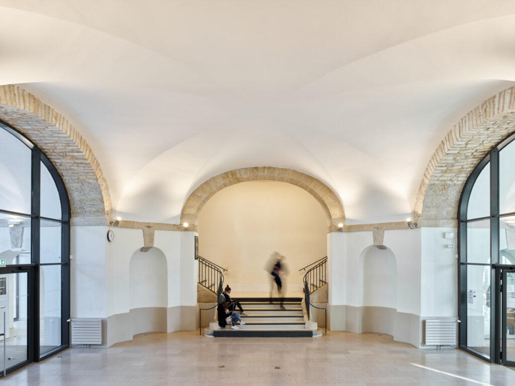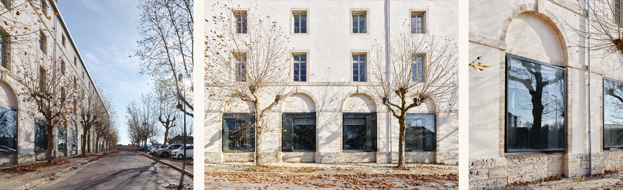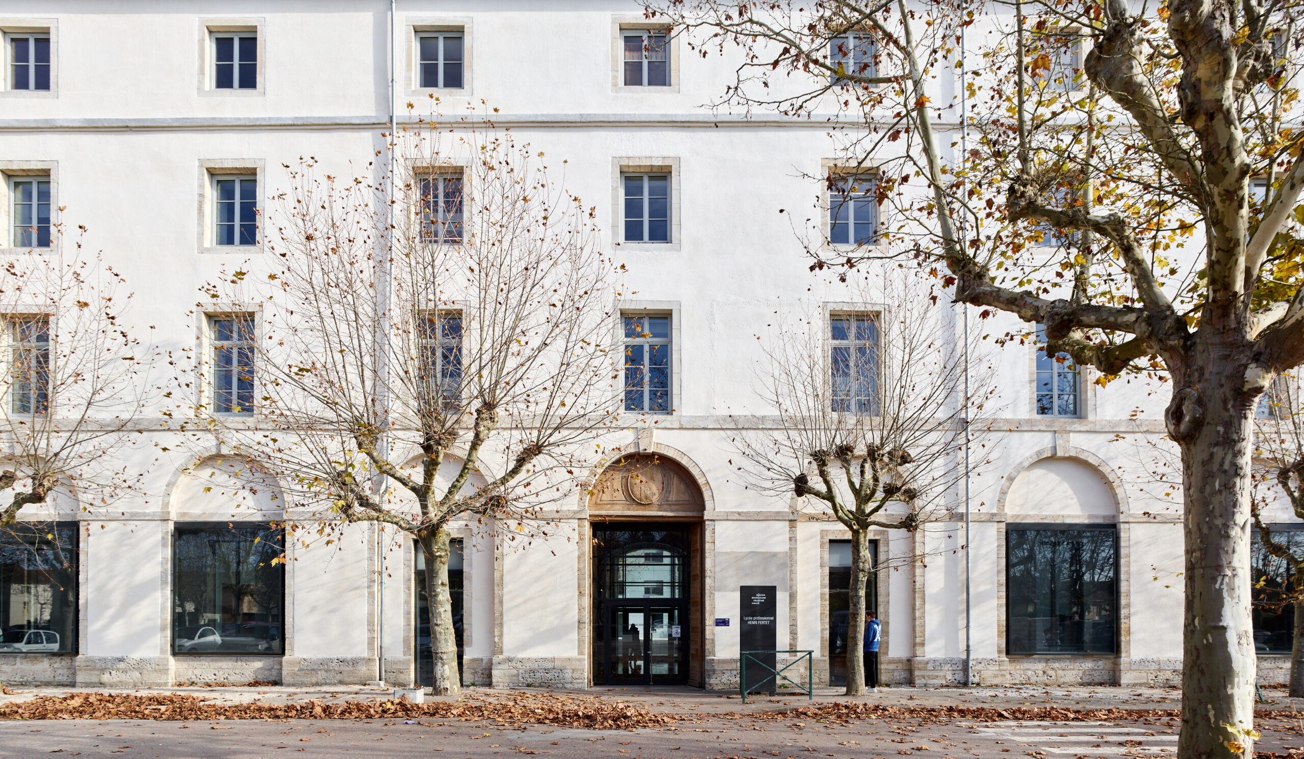 L’ancienne caserne de la cavalerie des 12ème hussards, construite à la fin du XVIIème siècle par Louis Aubert, est aujourd’hui occupée par le lycée professionnel Henri Fertet. Le projet de restructuration du lycée s’inscrit dans un ensemble bâti ancien à forte valeur patrimoniale, dont la façade principale compose l’ancienne place d’arme devenue la place du Général Boichut. Si cet ancien site militaire a subi de nombreuses modifications au cours du XXème siècle pour accueillir une gendarmerie puis un centre d’apprentissage devenu le lycée actuel, le bâtiment principal d’entrée sur lequel s’est concentrée notre intervention a été relativement préservé, pour conserver encore aujourd’hui son identité militaire en lien à l’ouest avec son ancienne place d’arme.